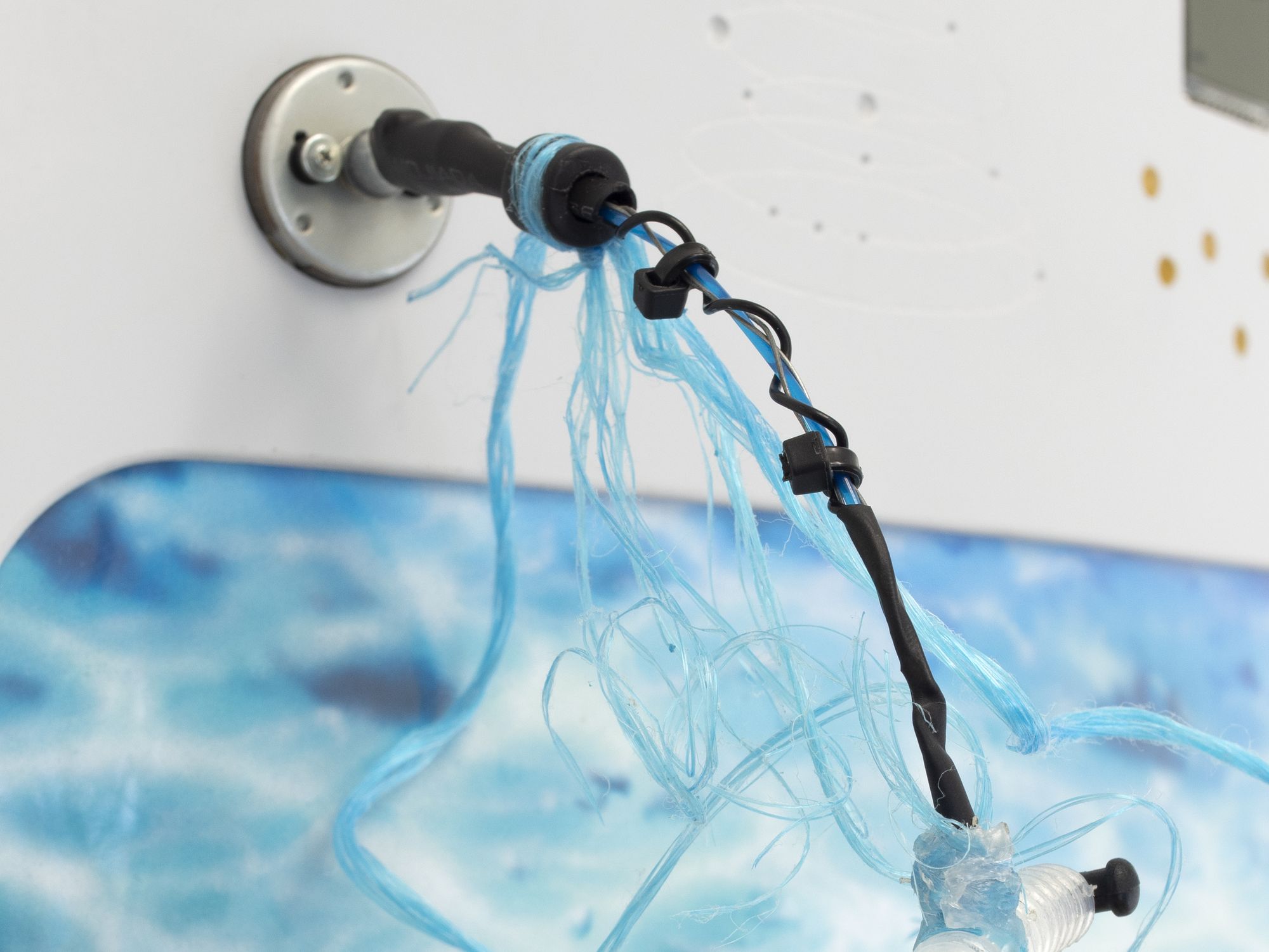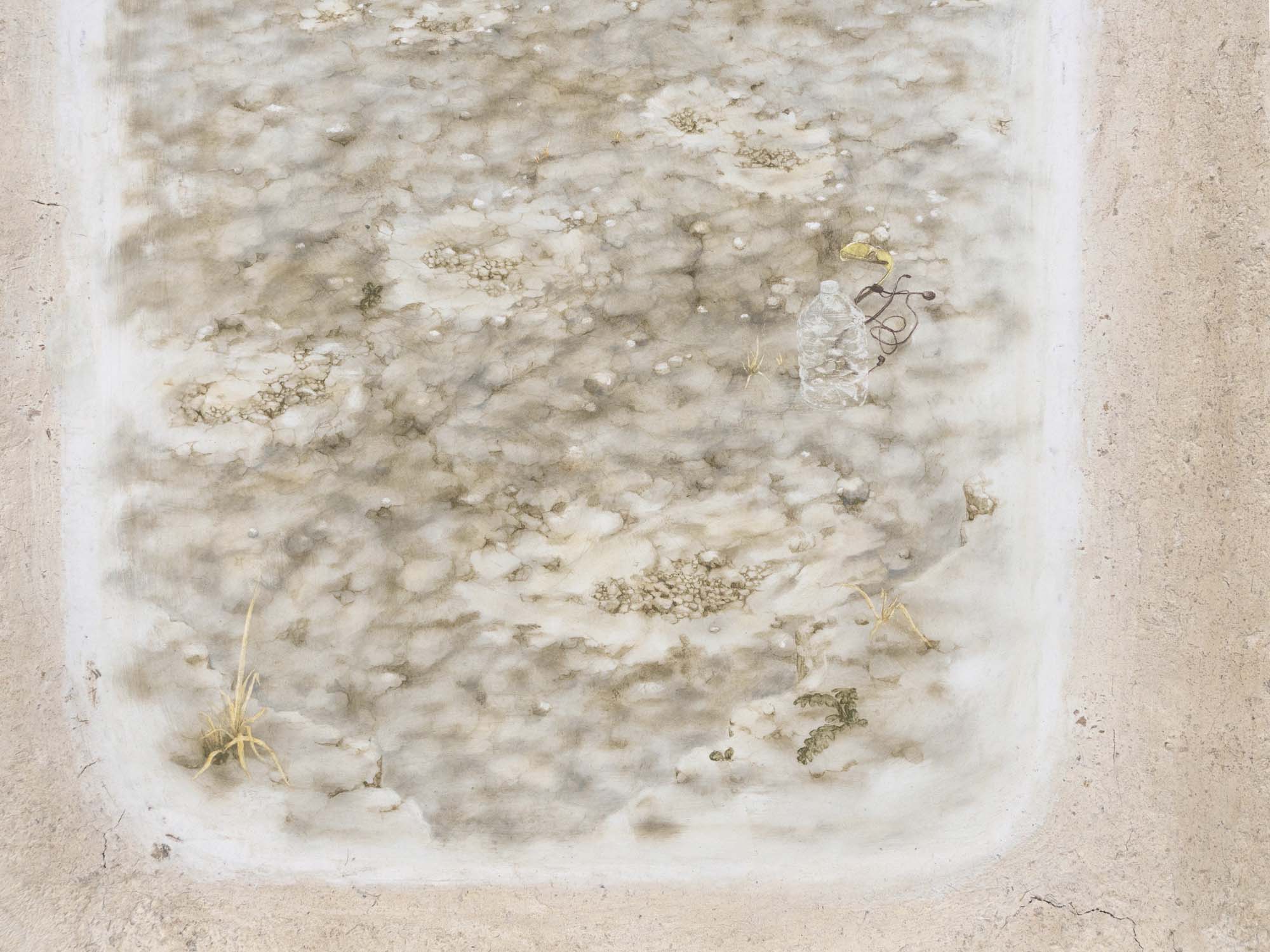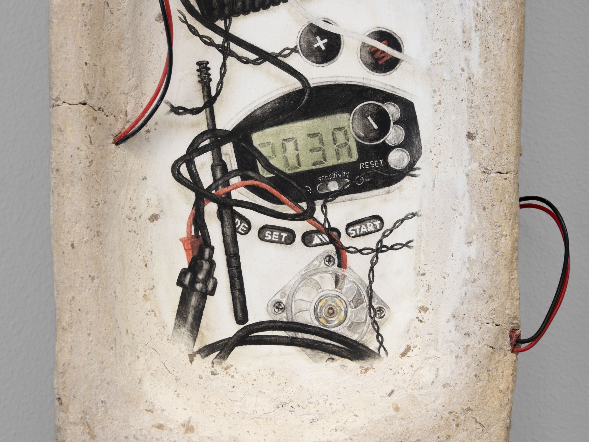 Torchis, dessin sur chaux, composants électroniques, bois, linoléum