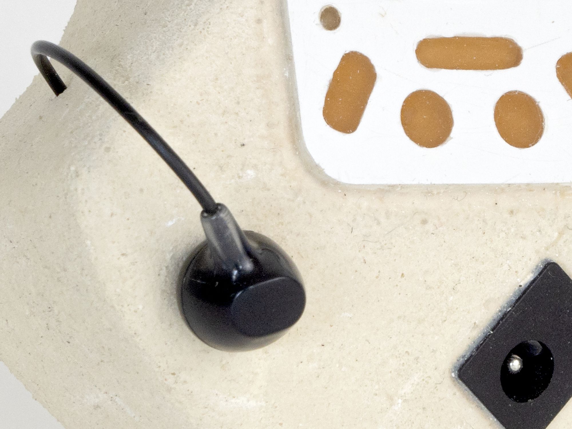 Torchis calcaire et paille locale, bois, pigments, latex, composants électroniques, mousse