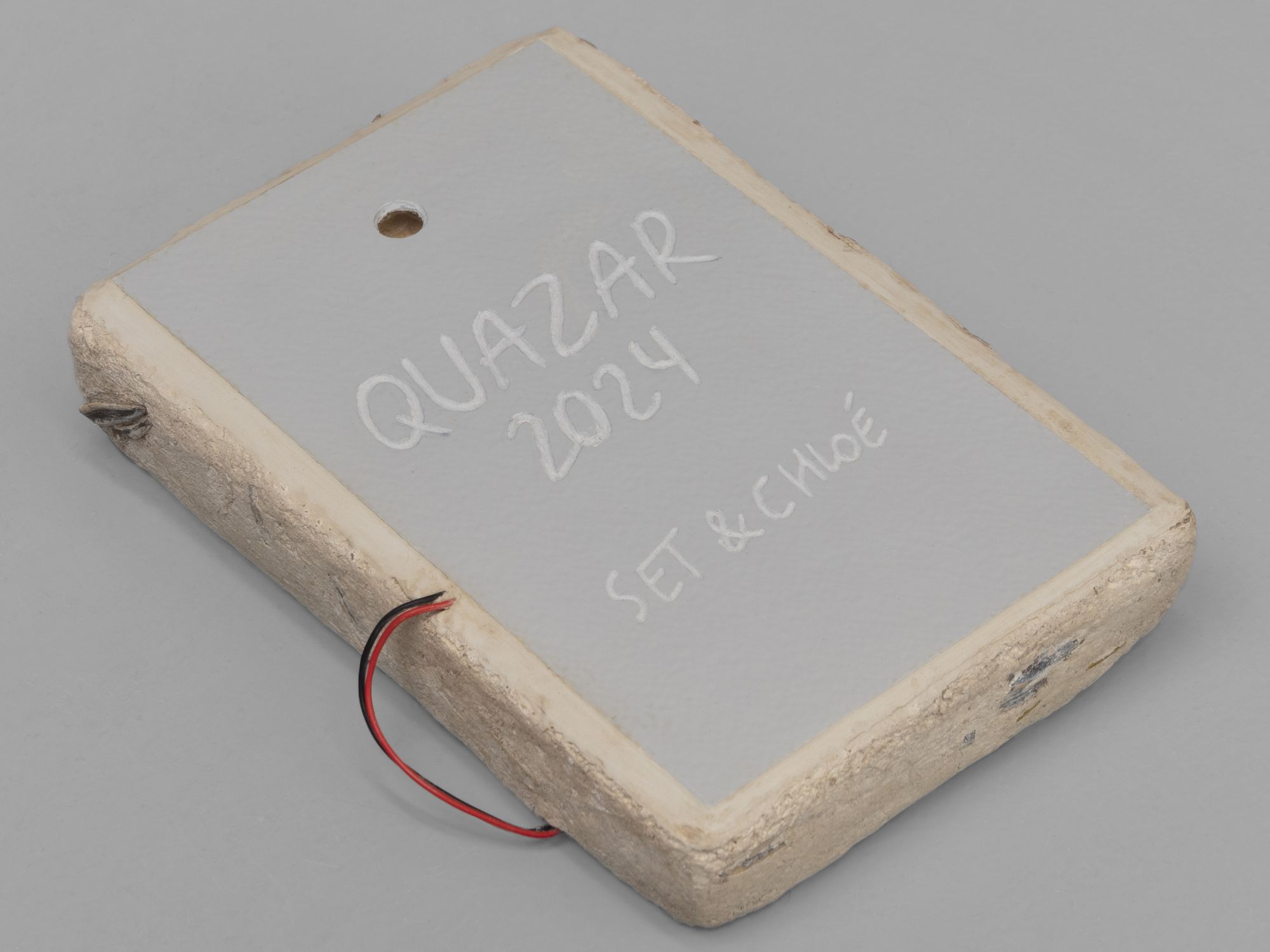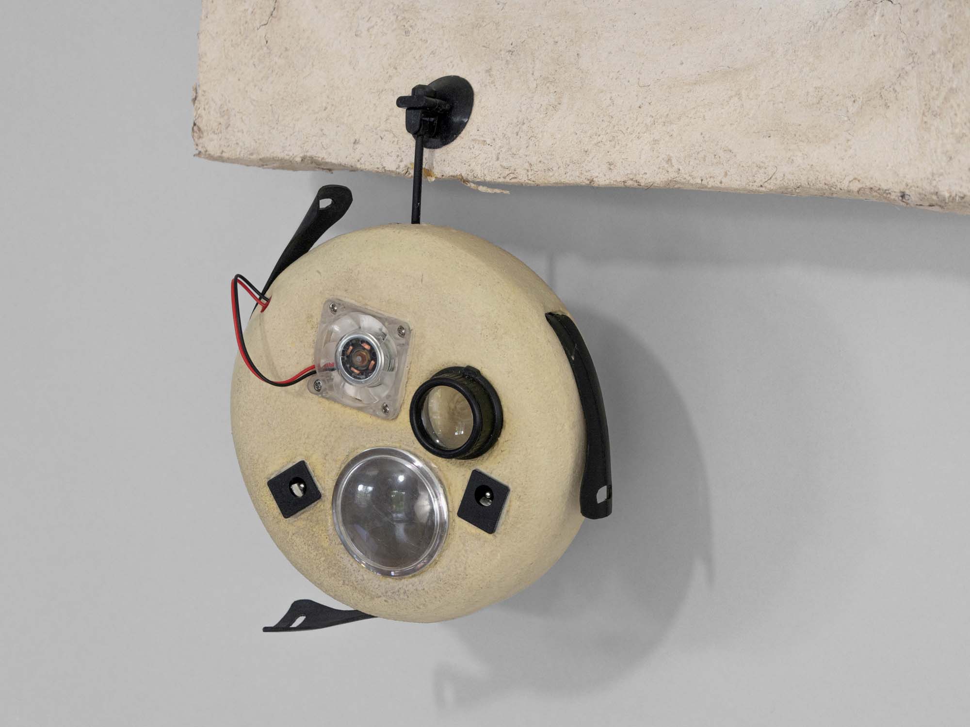 Torchis calcaire et paille locale, bois, pigments, lanceur, frisbee, latex, composants électroniques, mousse et caoutchouc