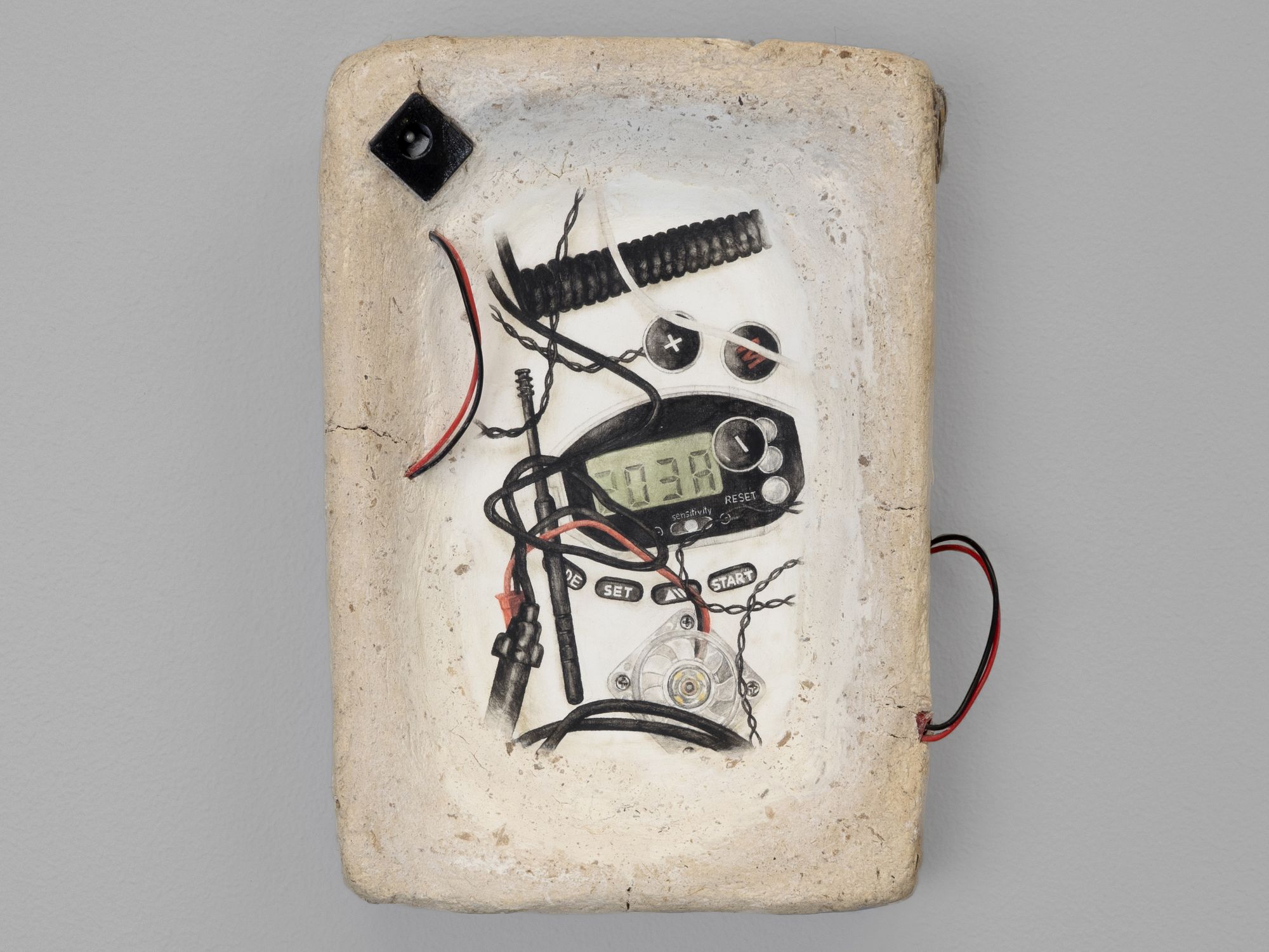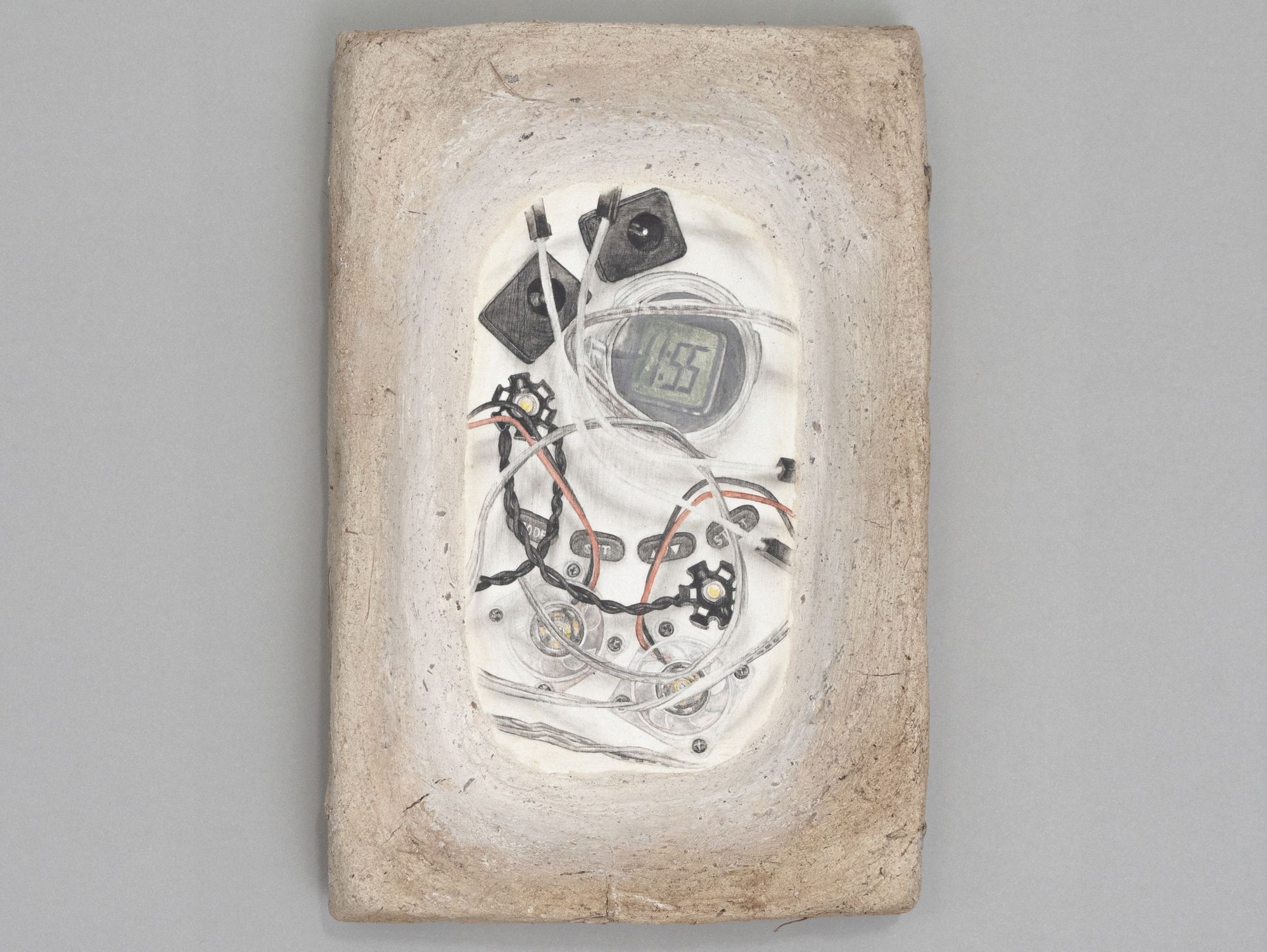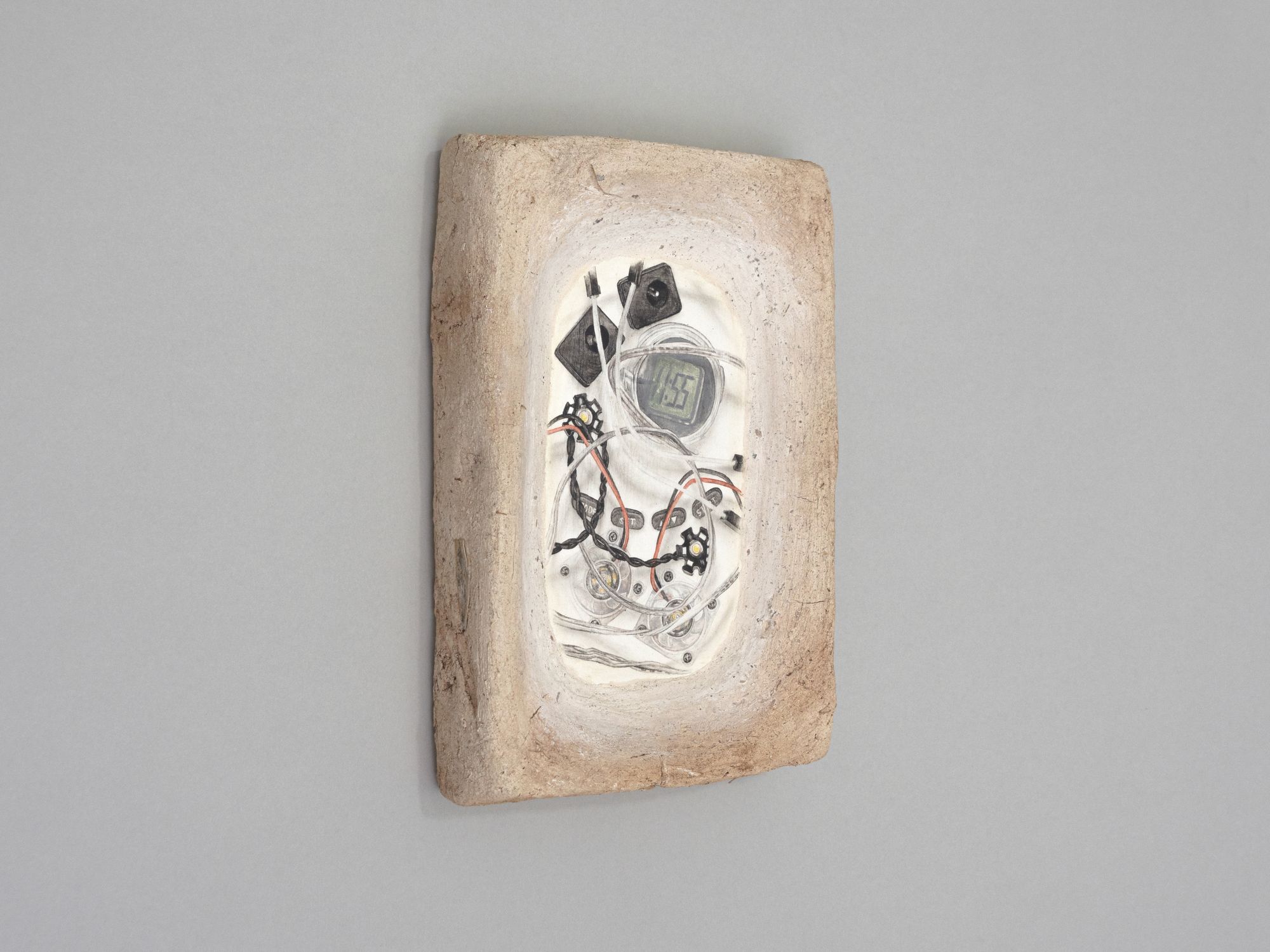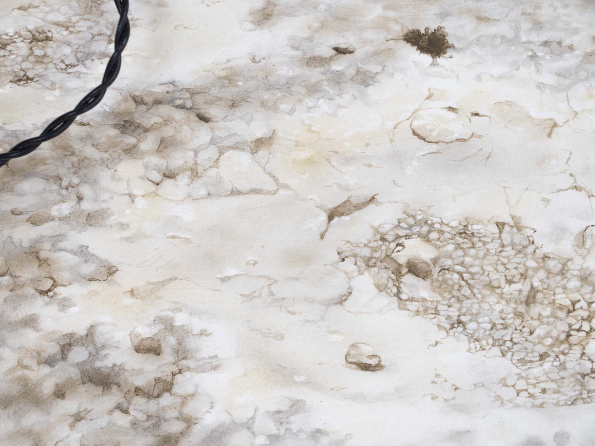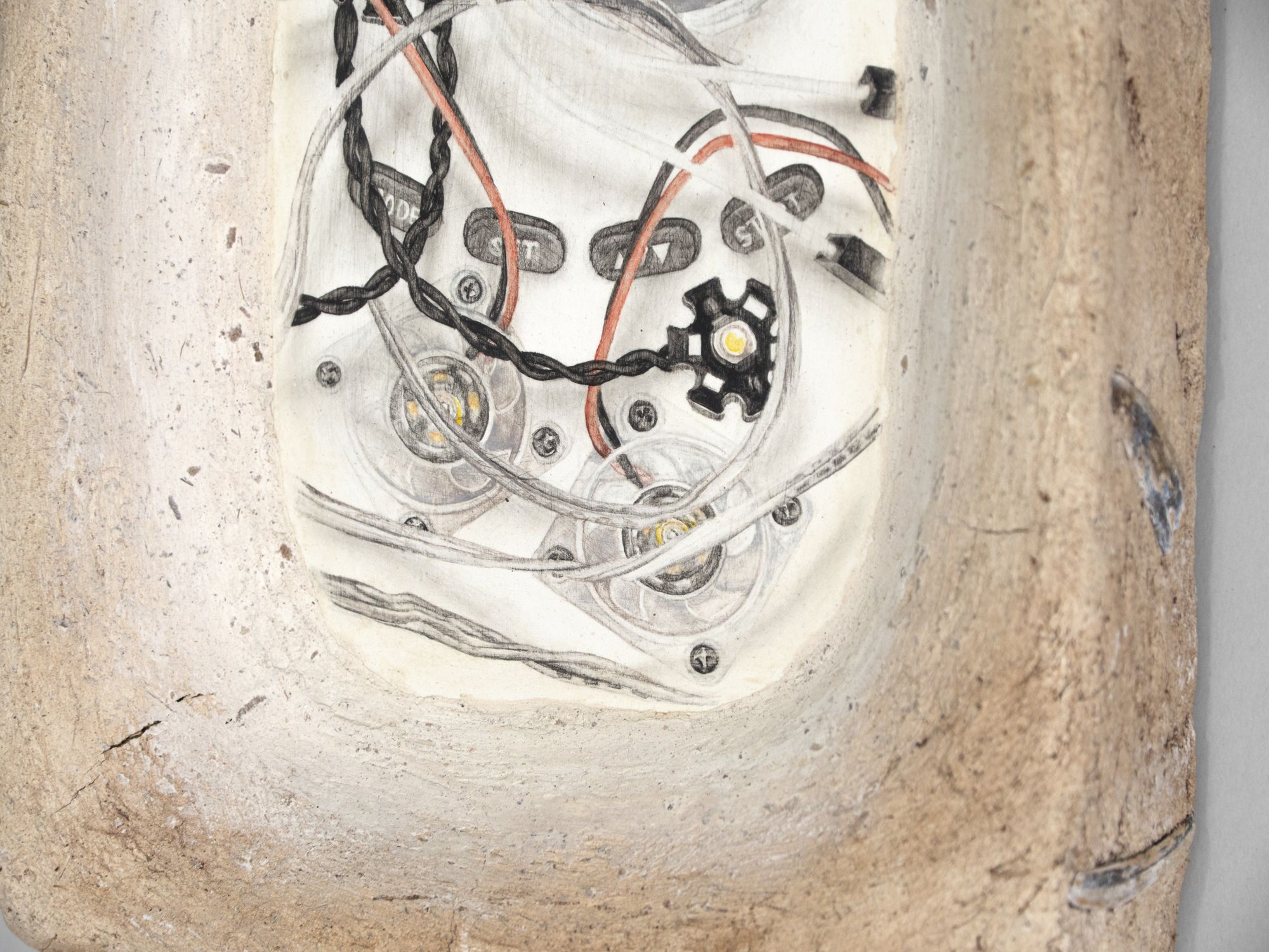 Torchis, dessin sur chaux, composants électroniques, bois, linoléum