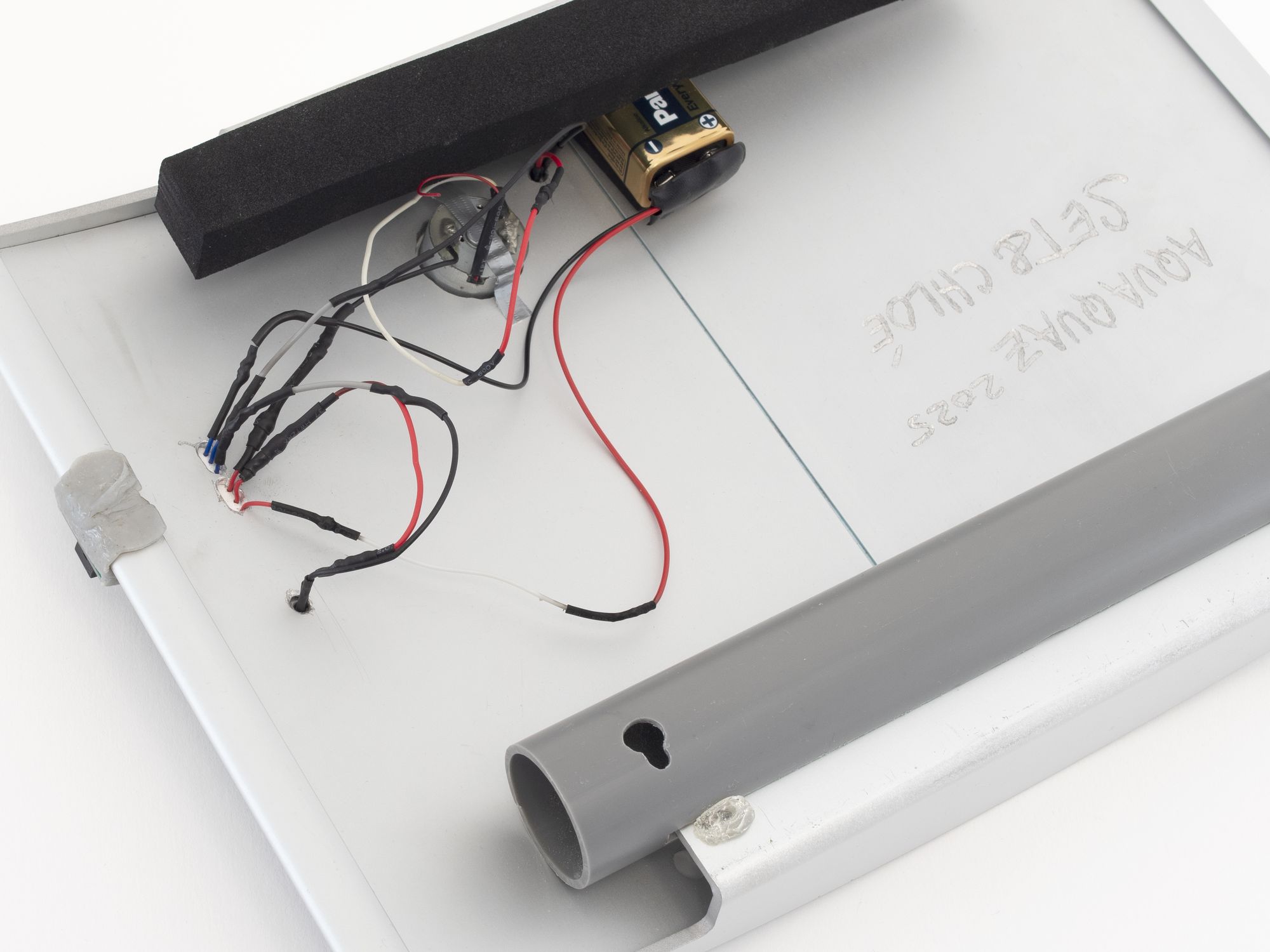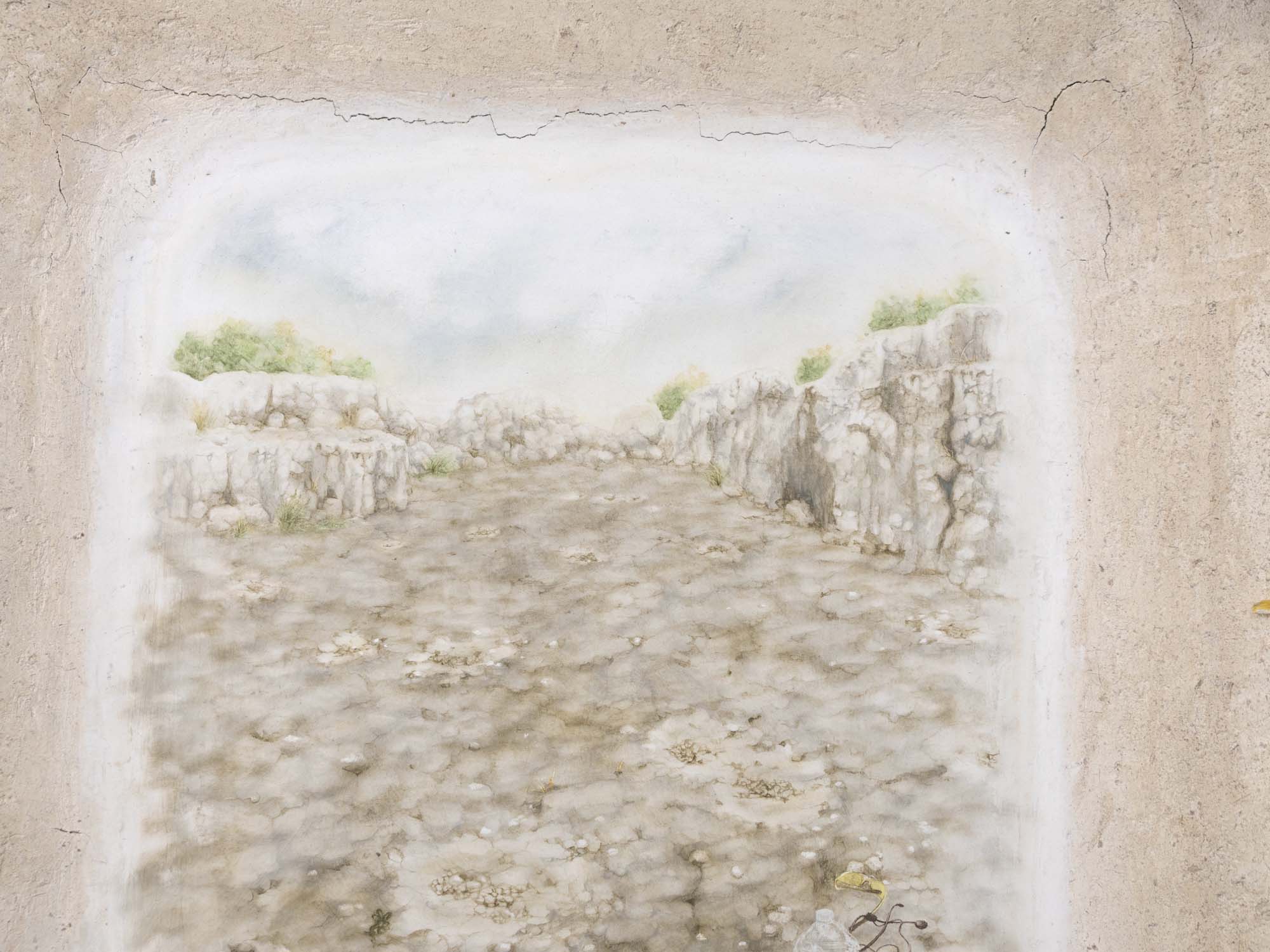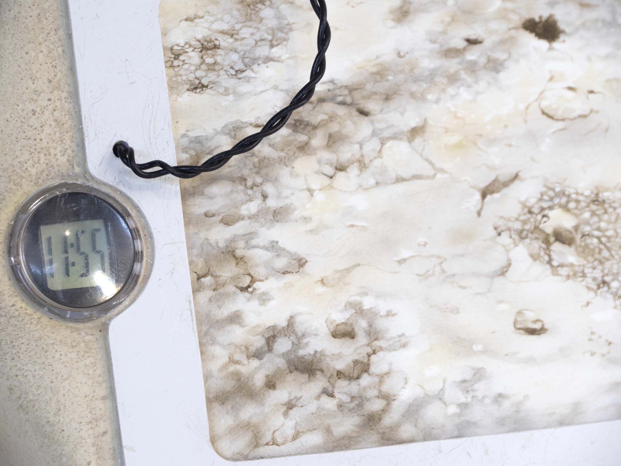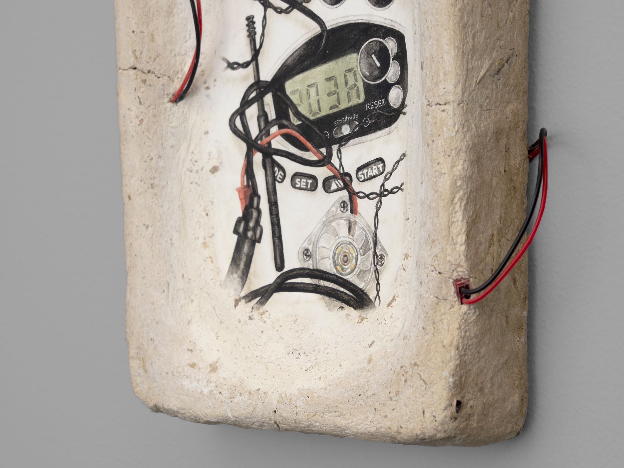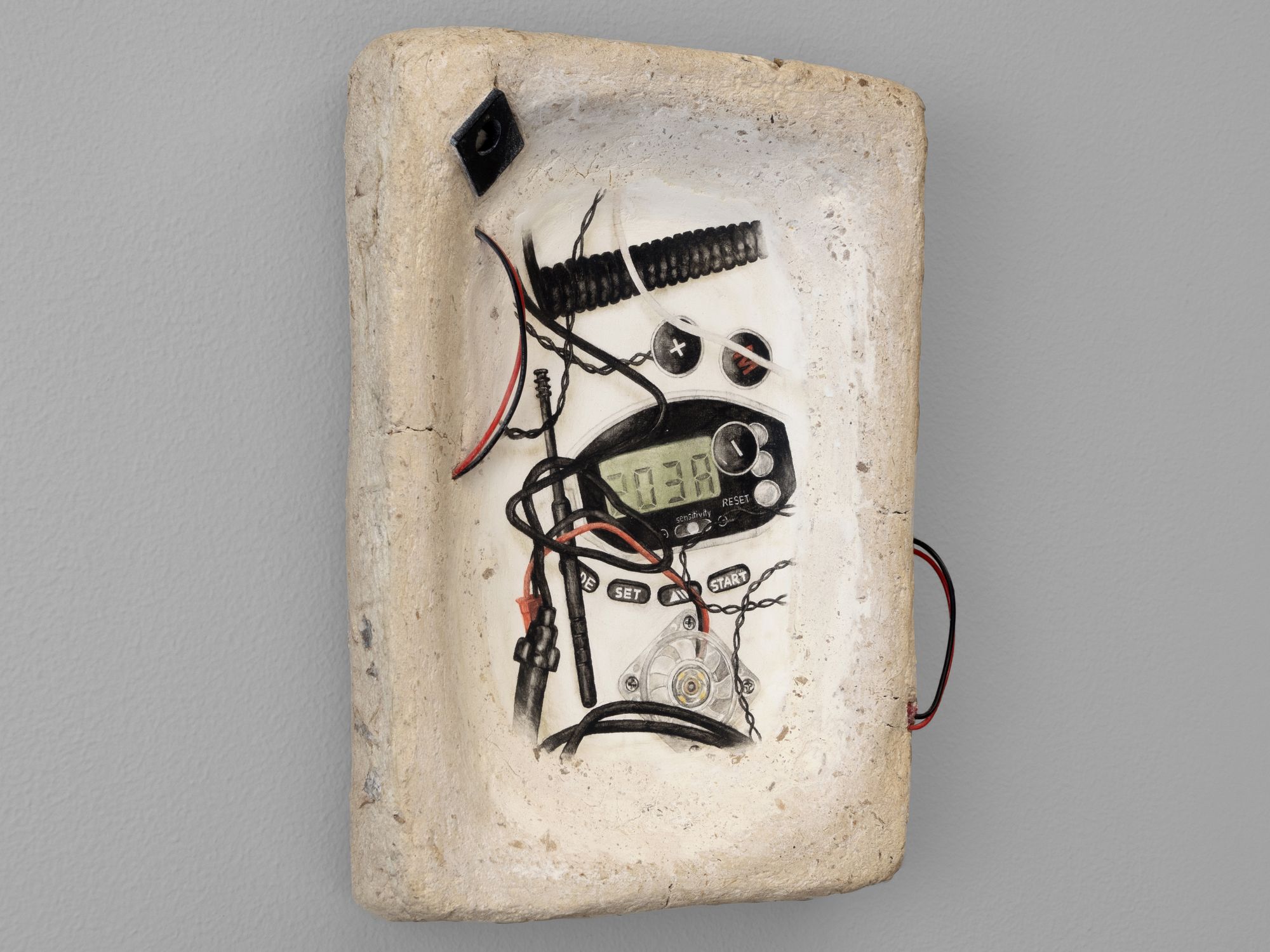 Torchis, dessin sur chaux, composants électroniques, bois, linoléum