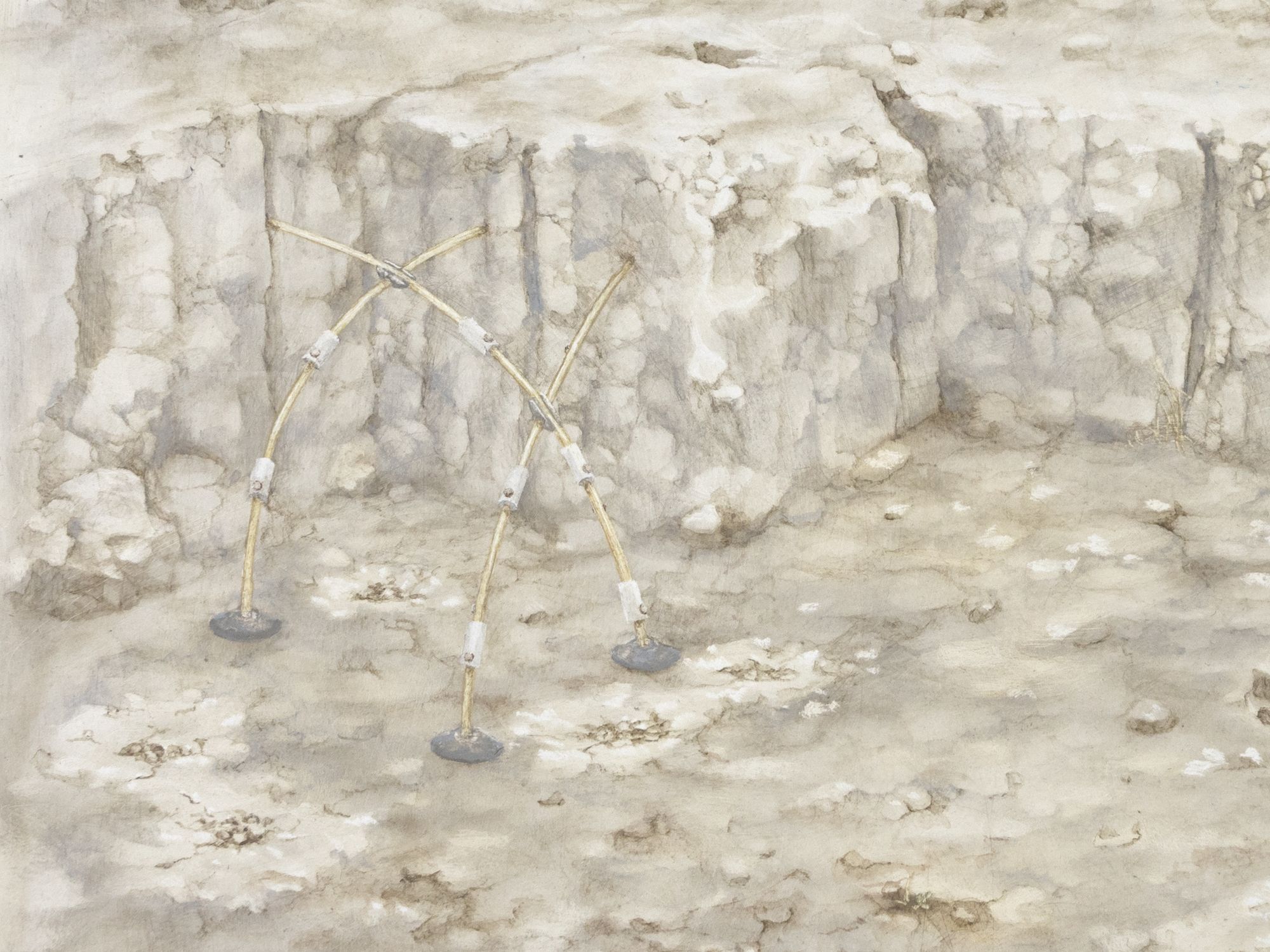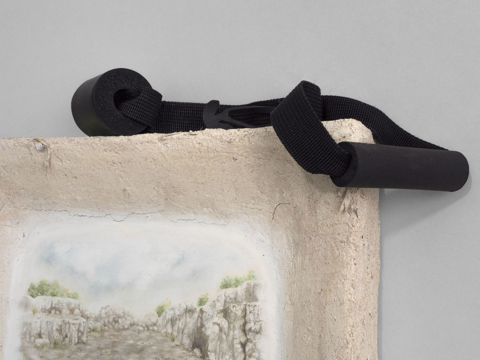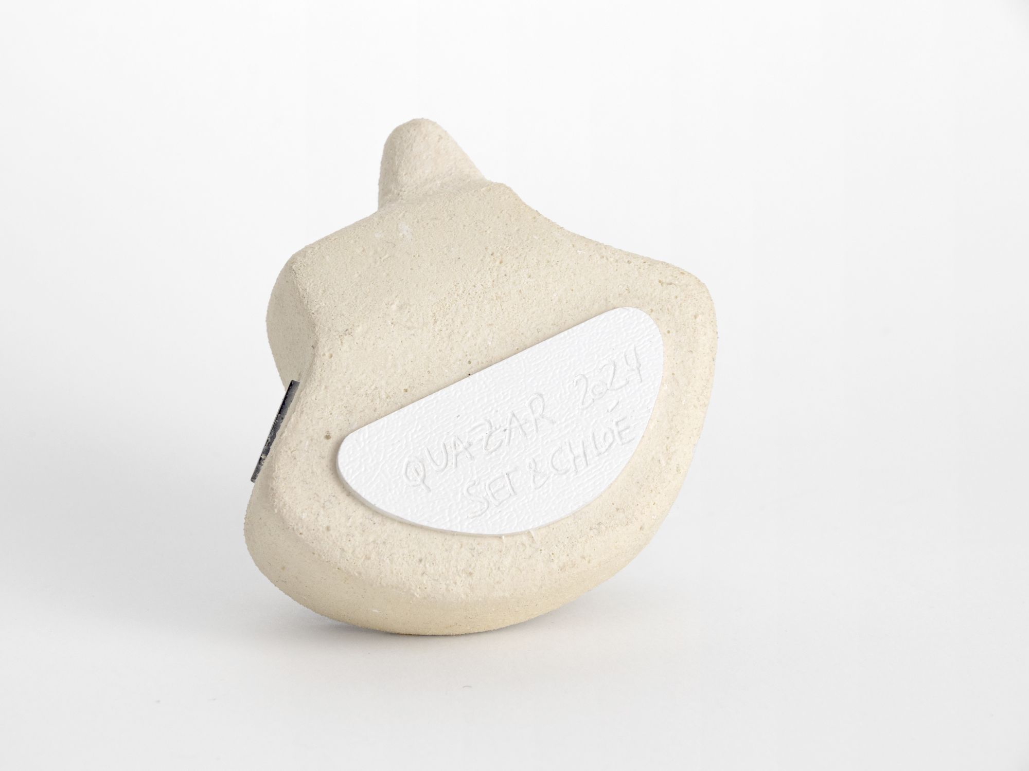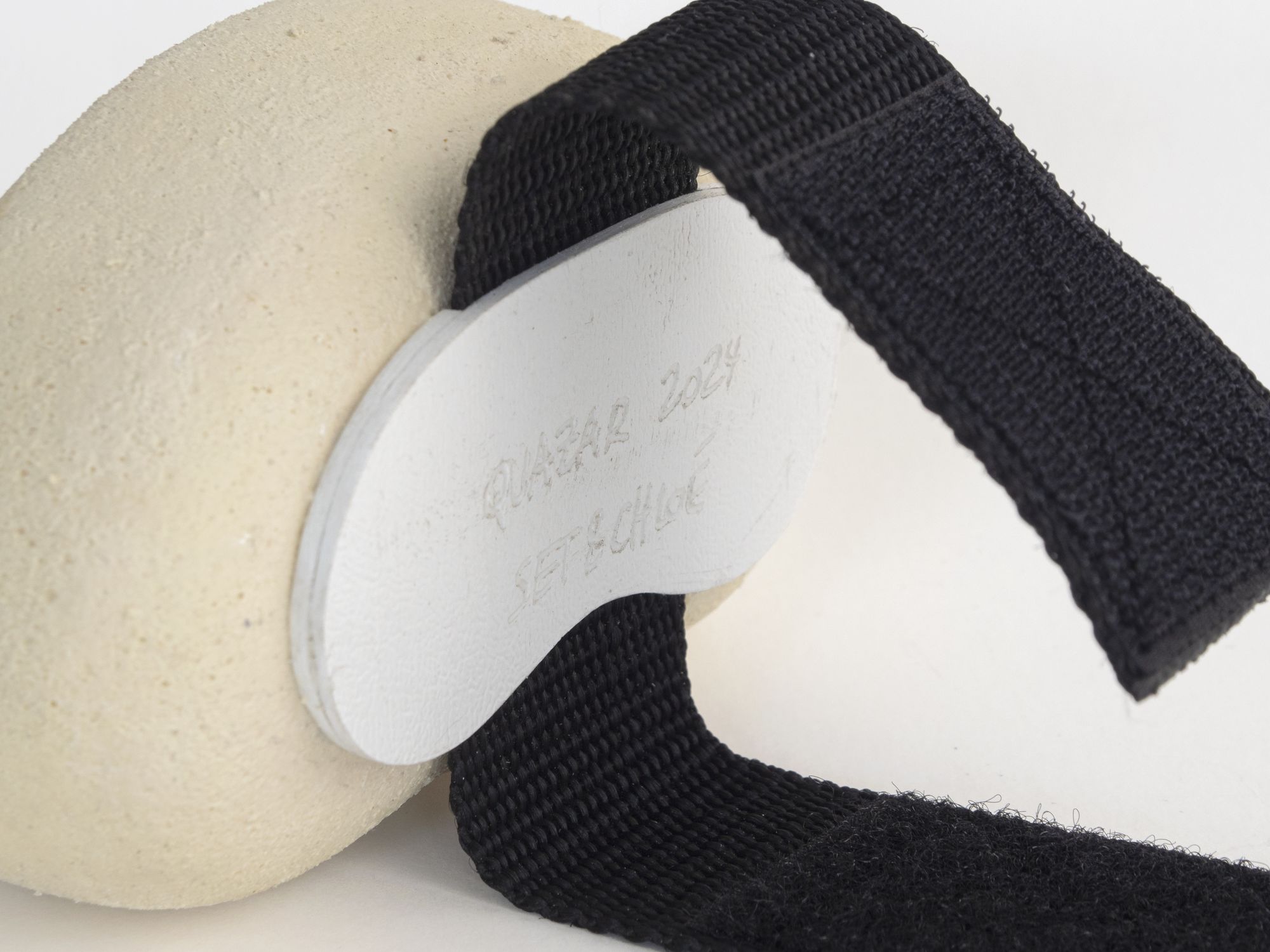 Torchis calcaire et paille locale, bois, pigments, lanceur, frisbee, latex, composants électroniques, mousse et caoutchouc