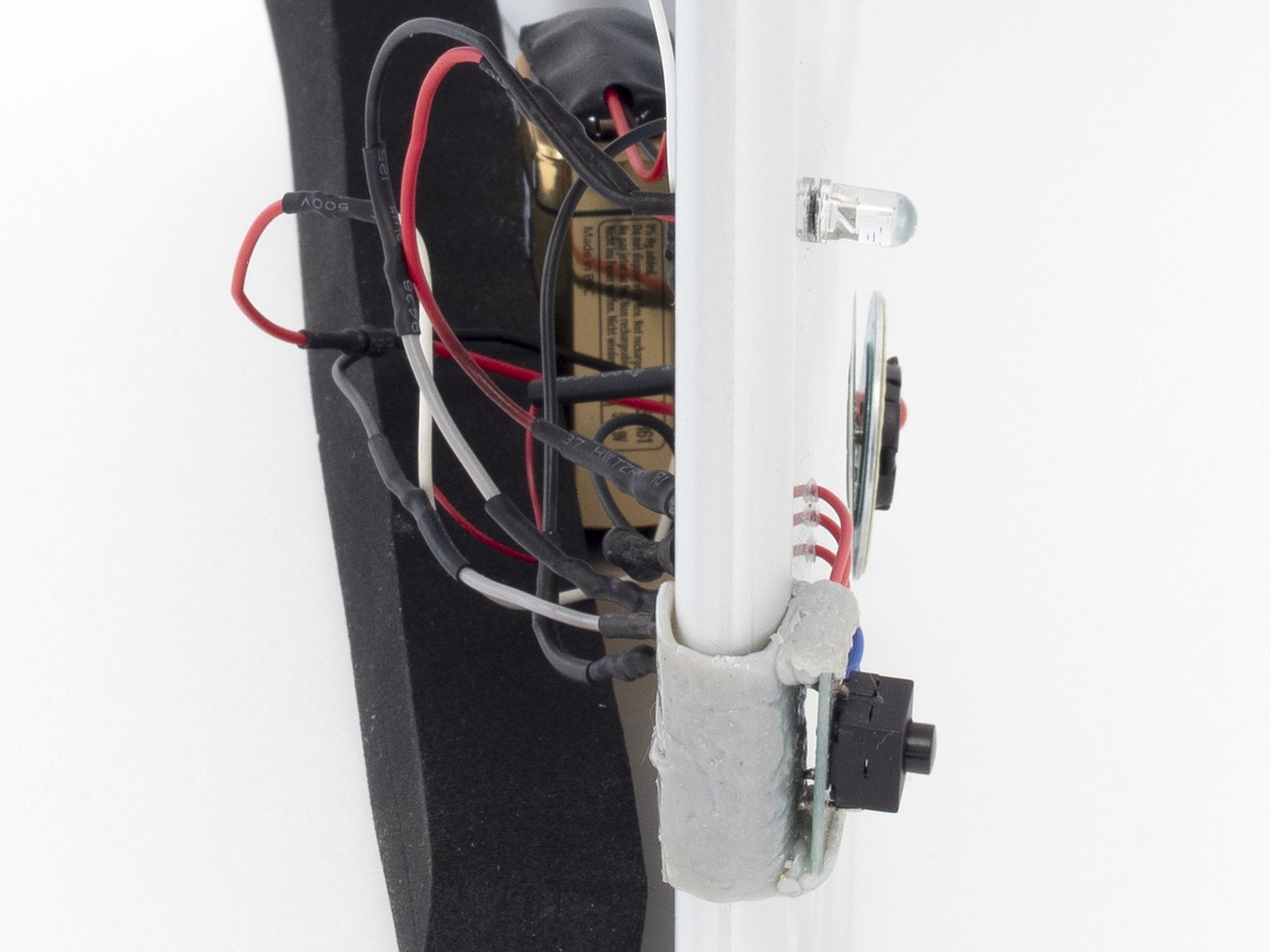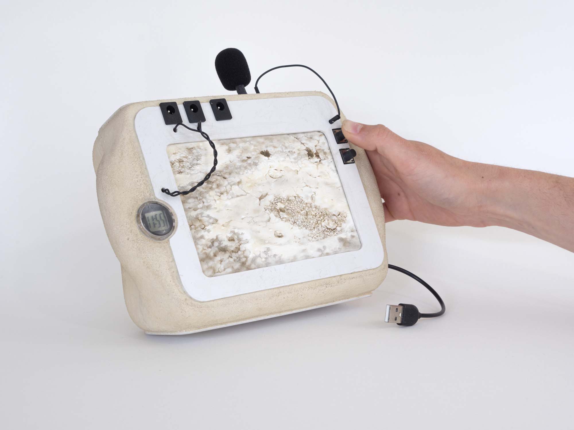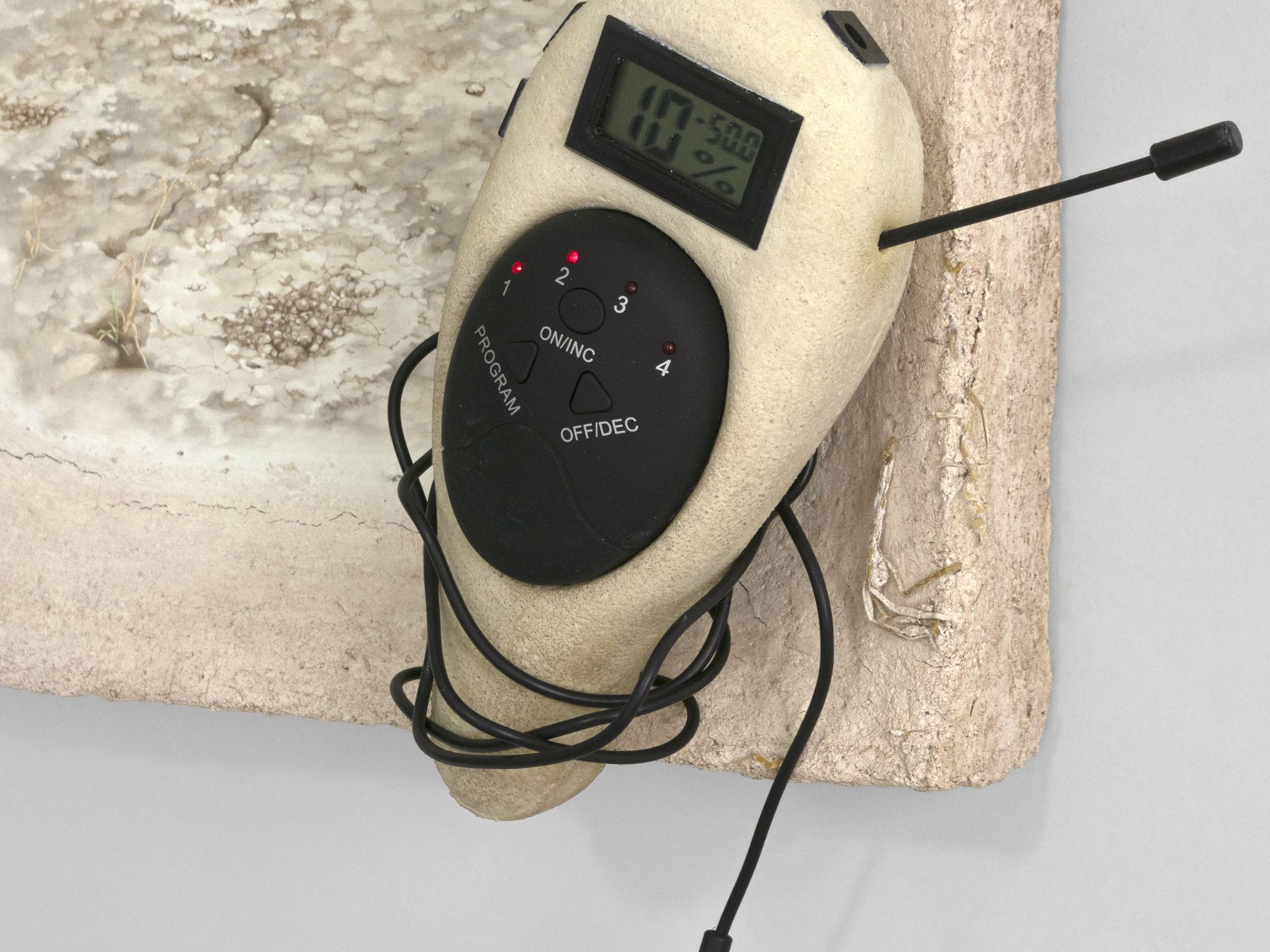 Torchis calcaire et paille locale, bois, pigments, latex, composants électroniques, mousse