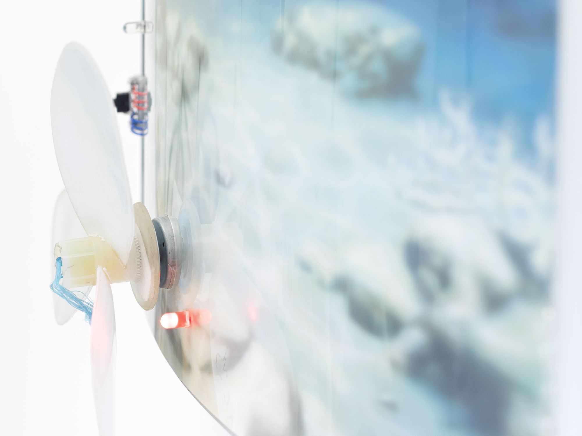 Torchis calcaire et paille locale, bois, pigments, ventilateurs, linoléum
